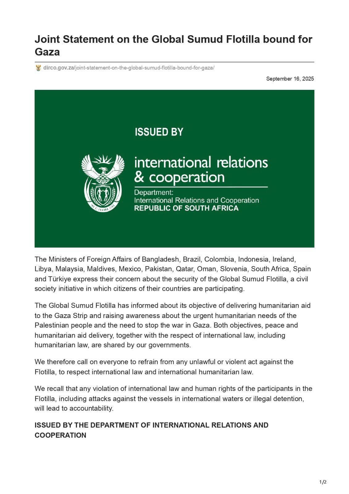 Bangladeş, Brezilya, Kolombiya, Endonezya, İrlanda, Libya, Malezya, Maldivler, Meksika, Pakistan, Katar, Umman, Slovenya, Güney Afrika, İspanya ve Türkiye’nin Dışişleri Bakanları, vatandaşlarının da katıldığı bir sivil toplum teşebbüsü olan Global Sumud Filosu’nun güvenliğine ait ortak açıklamada bulundu.
