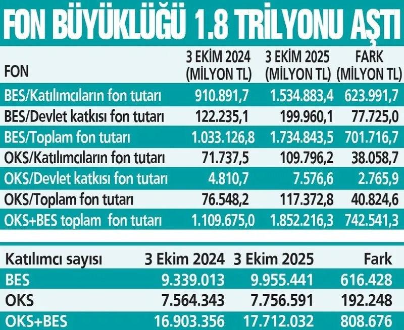 OKS dahil BES’te toplam iştirakçi sayısı 17.7 milyonu, fon büyüklüğü de 1.8 trilyon lirayı aşarken, 1 yılda iştirakçi sayısında yaklaşık 808 bin, fon meblağında 742 milyar liralık artış yaşandı.