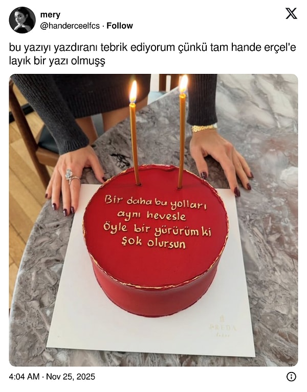 32 yaşına giren ünlü oyuncu Hande Erçel, kendisi için yaptırılan tüm pastaları tek tek paylaştı. Bilhassa bir adedinin üstündeki olay gönderme dikkat çekti!