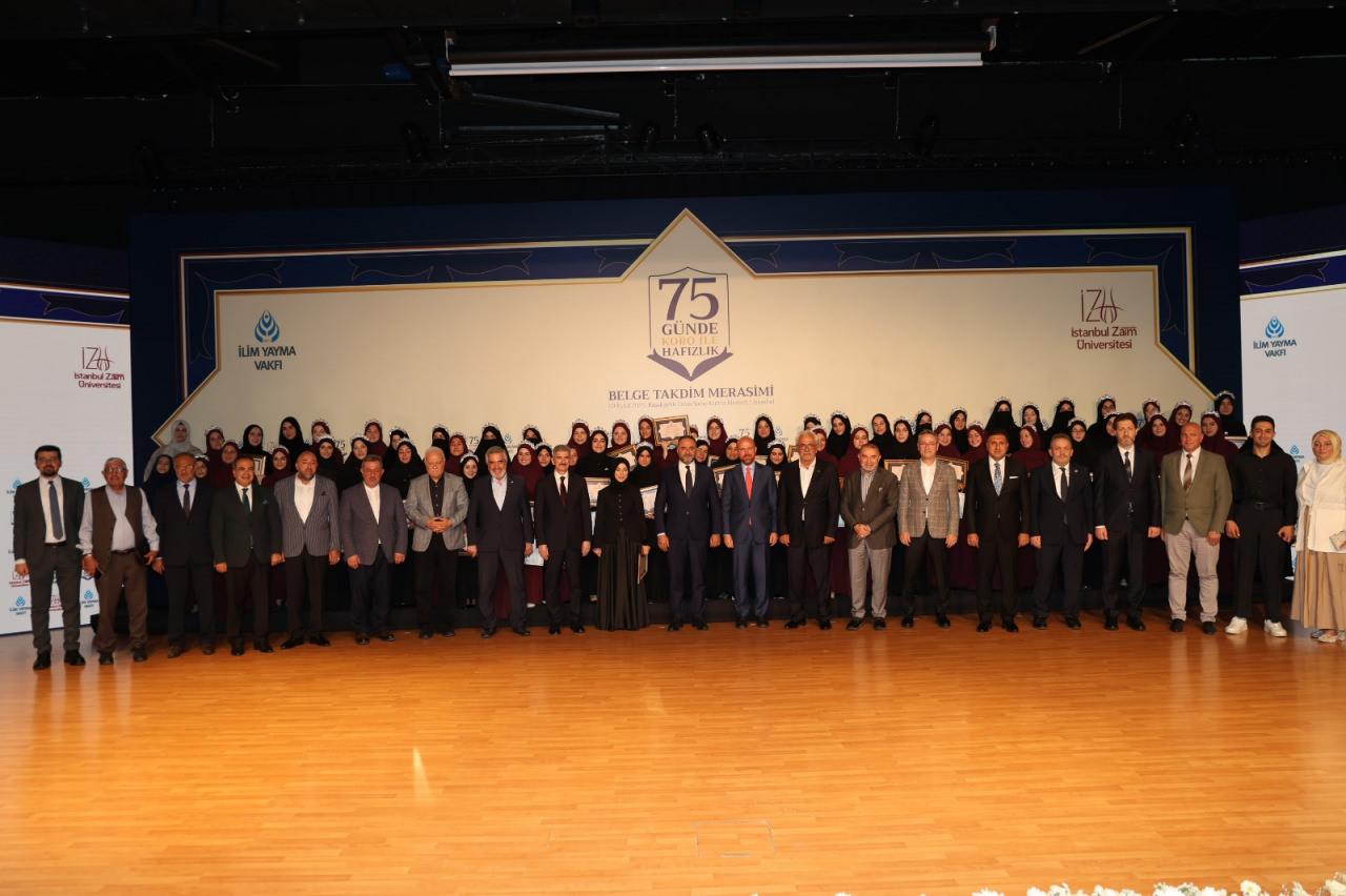 Katılımcıların 75 günlük ağır ve disiplinli bir eğitim süreci sonunda hafız oldukları programın evrak takdim merasimine; Anayasa Mahkemesi Üyesi Saygıdeğer İnce, Cumhurbaşkanlığı Başdanışmanı İsrafil Kışla, İlim Yayma Vakfı (İYV) Mütevelli Heyeti Başkanı Necmeddin Bilal Erdoğan, İZÜ Rektörü Prof. Dr. Ahmet Cevat Acar, Başakşehir Kaymakamı Cemil Özgür Öneği, Başakşehir Belediye Başkanı Yasin Kartoğlu, İstanbul Vilayet Ulusal Eğitim Müdürü Doç. Dr. Murat Mücahit Yentür, İZÜ İslami İlimler Fakültesi Dekanı Prof. Dr. Hasan Kâmil Yılmaz ve İYV Genel Müdürü İdris Tankut Küsmezer ile çok sayıda davetli katıldı.