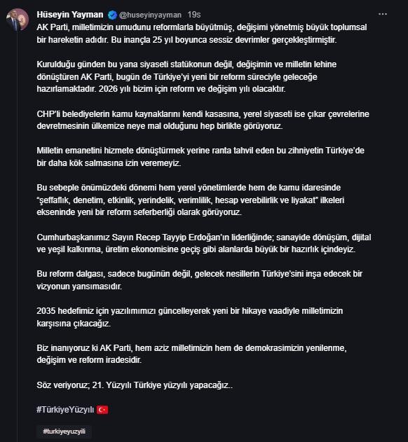 “Kurulduğu günden bu yana siyaseti statükonun değil, değişimin ve milletin lehine dönüştüren AK Parti bugün de Türkiye’yi yeni bir ıslahat süreciyle geleceğe hazırlamaktadır. 2026 yılı bizim için ıslahat ve değişim yılı olacaktır.” ifadelerini kullanan Yayman, şunları kaydetti: