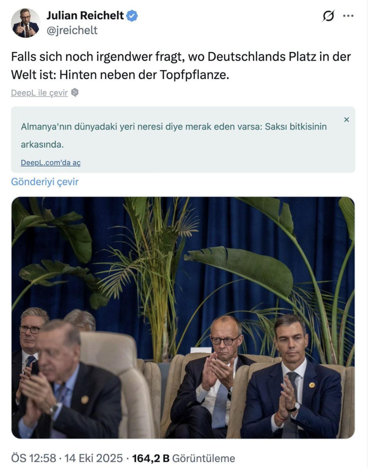 Ardından, “Almanya’nın dünyadaki yeri neresi diye merak eden varsa: Saksı bitkisinin gerisinde.” tabirlerini not düştü.