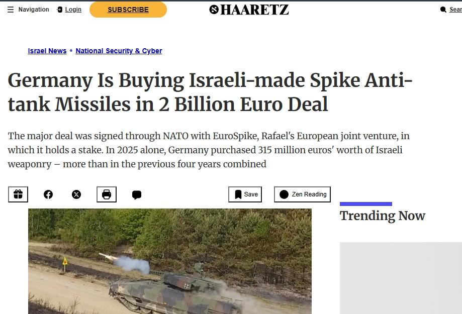 Alman hükümetinin parlamento soruşturmasına verdiği resmi karşılığa nazaran, Alman ordusu 2025 yılında Spike mutabakatı hariç 315 milyon avro pahasında İsrail silahı satın aldı. Bu, evvelki dört yılda İsrail silahlarına harcanan toplam ölçüden daha fazla.