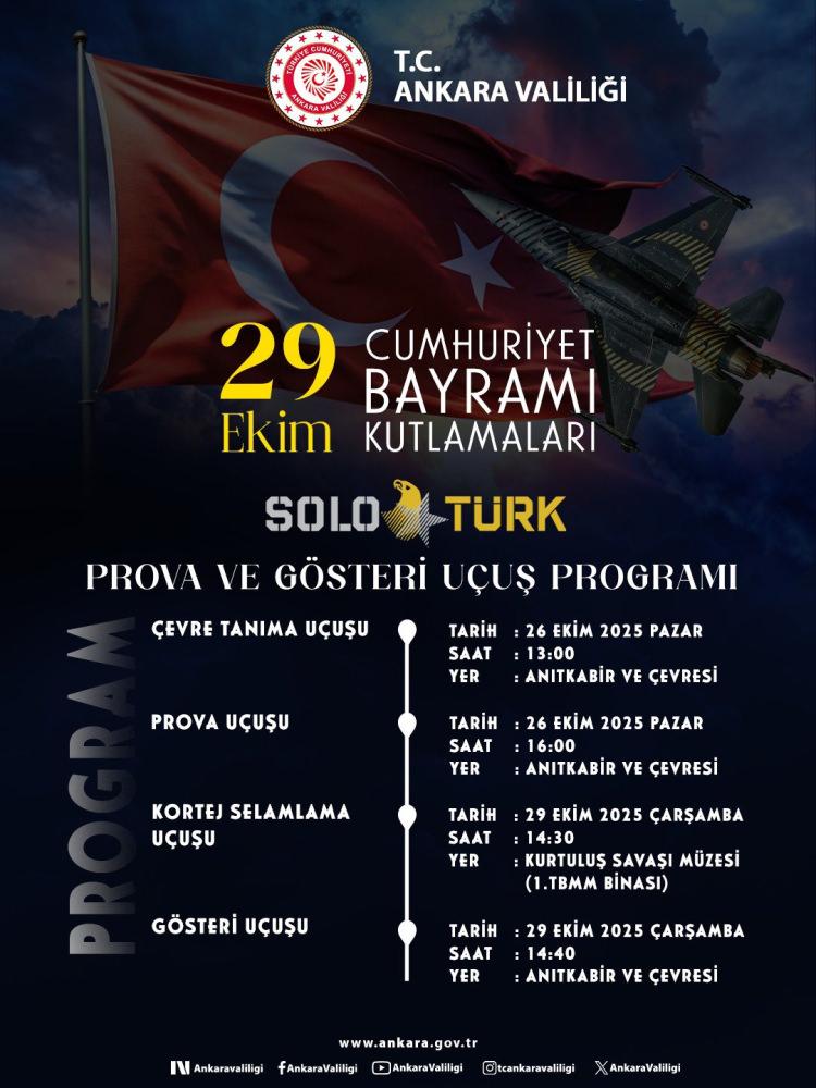 Valilikten yapılan açıklamada, 29 Ekim Cumhuriyet Bayramı kutlama aktiflikleri kapsamında SOLOTÜRK’ün Ankara’da 26-29 Ekim’de keşif, prova ve şov uçuşları gerçekleştireceği belirtildi.