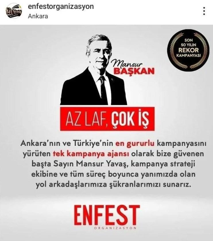 ABB’den milyonlarca liralık ihaleler alan Enfest ve Festiva’nın sahibi Çetinkaya’nın ayrıyeten Yavaş’ın “Az laf çok iş” sloganıyla seçim kampanyasını yürüten isim olduğu belirlendi.