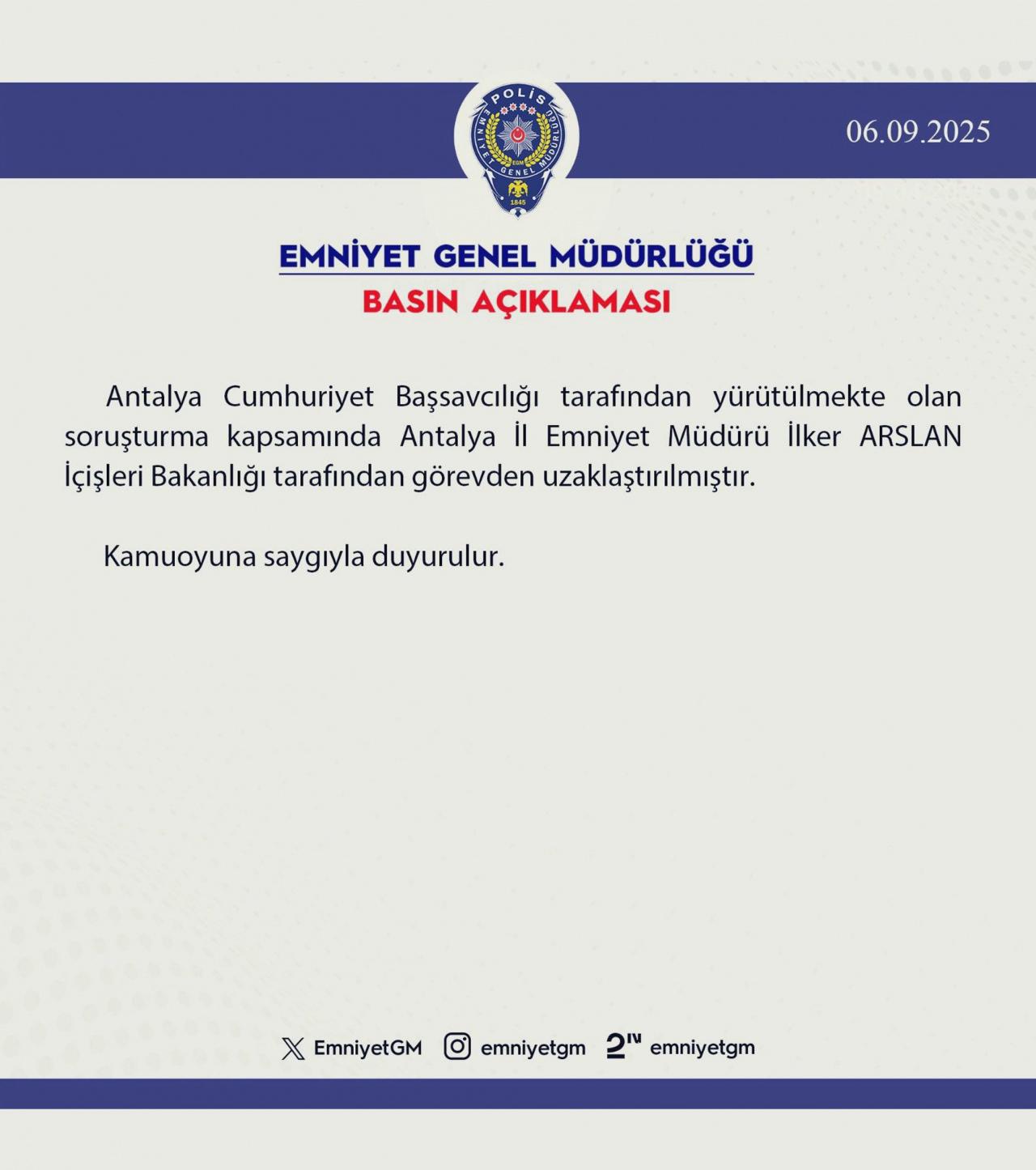 Emniyet Genel Müdürlüğünden yapılan açıklamada, “Antalya Vilayet Emniyet Müdürü İlker Arslan yürütülen soruşturma kapsamında vazifeden uzaklaştırıldı.” denildi.