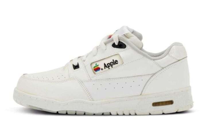 Beyaz ayakkabıların üzerinde Apple’ın gökkuşağı renklerindeki eski logosu yer alıyor.