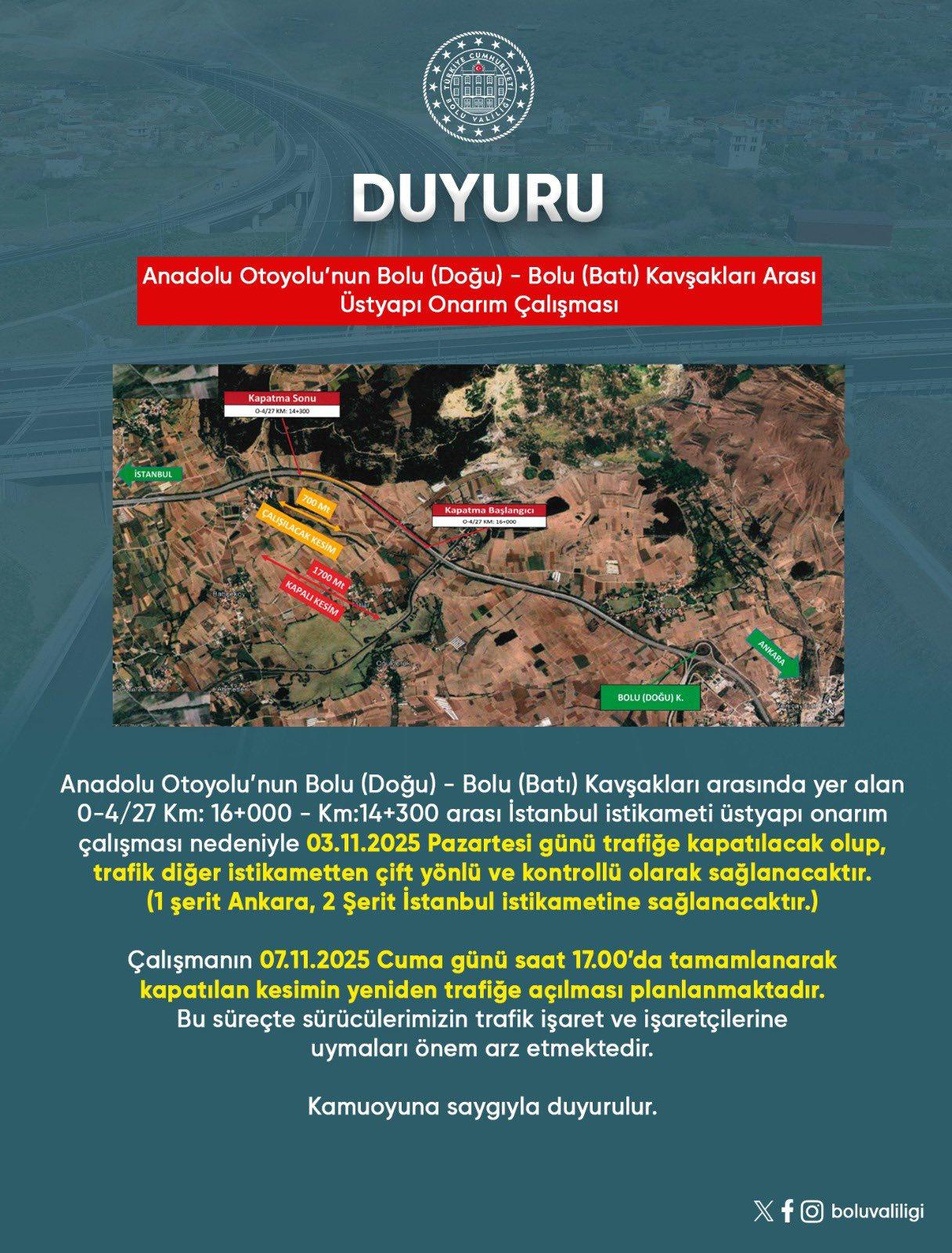 Bolu Valiliği, yol tamiratının 07 Kasım 2025 Cuma günü saat 17.00’de tamamlanarak trafiğe yine açılmasının planlandığını duyurdu.