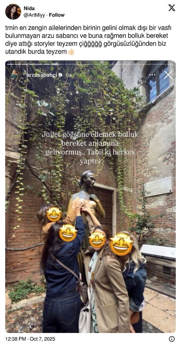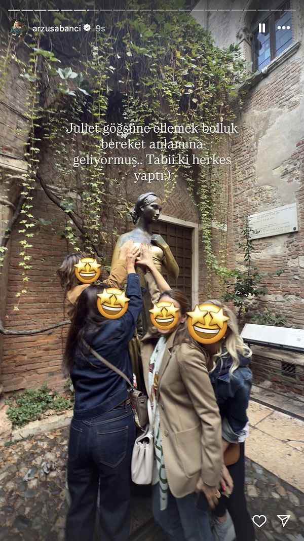 Arzu hanım ve çılgın arkadaşları, güya gereğince bolluk rahmet içinde yaşamıyormuş üzere ‘Dahası da gelsin’ dedi ve rahmet yağsın diye Juliet heykelinin göğsünü elledi. O kadar ki paylaşımı yaparken hem kendi hem de arkadaşlarının yüzüne, nedense emoji koydu…
