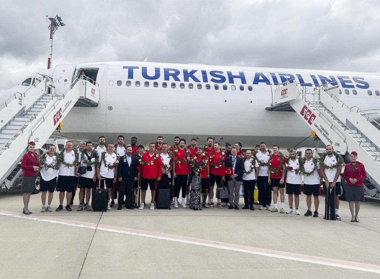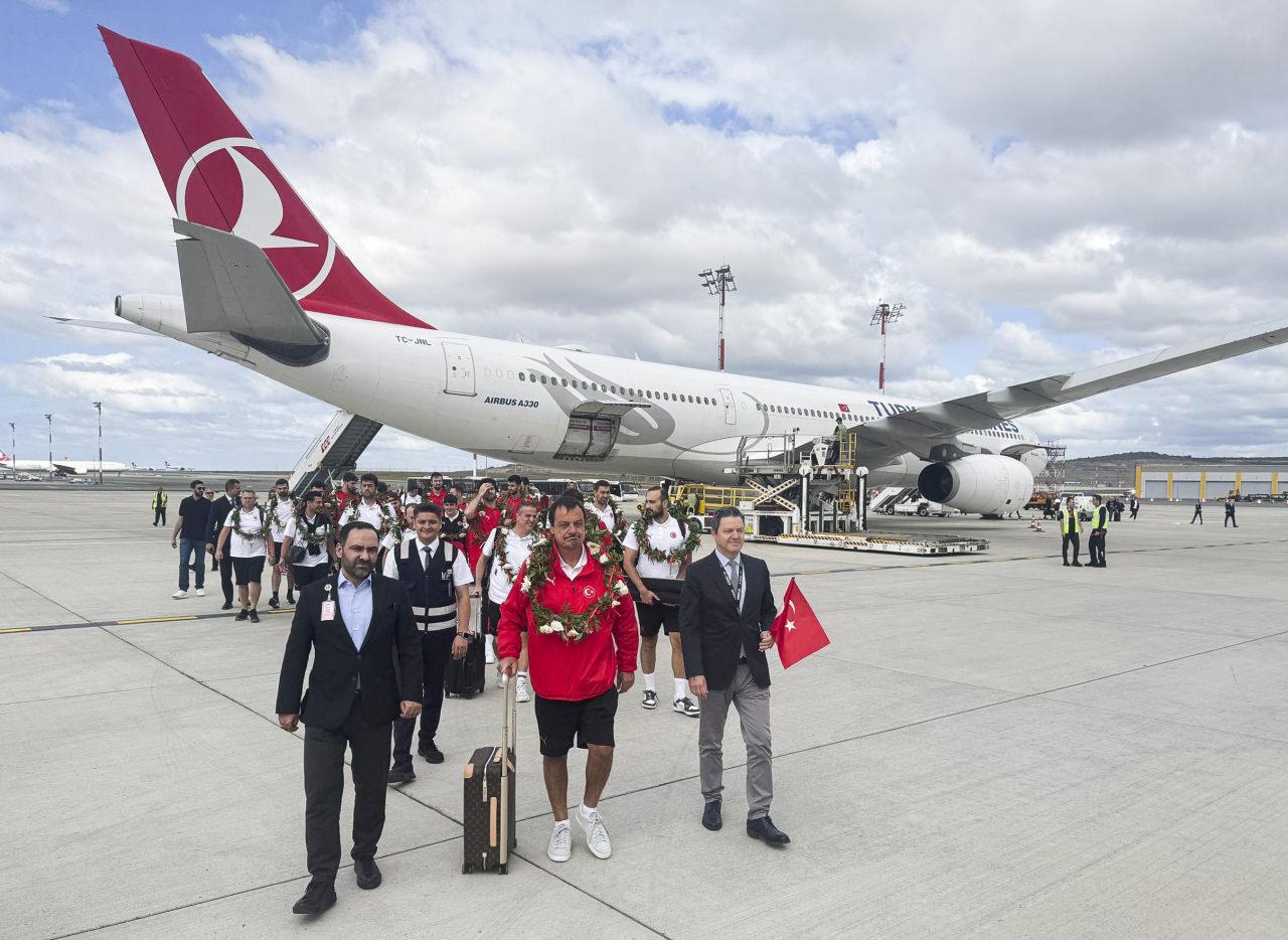 Avrupa Basketbol Şampiyonası’nda gümüş madalya kazanan ulusal atletlerimiz İstanbul Havalimanı’nda uçaktan inerken Türk bayrakları ve çiçeklerle karşılandı.