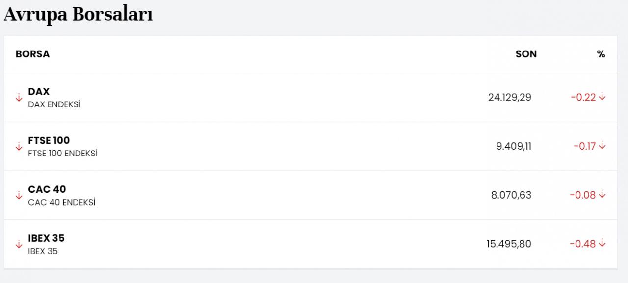 İtalya’da FTSE MIB 30 endeksi yüzde 0,2 düşüşle 41.826 puanda, İspanya’da IBEX 35 yüzde 0,6 kayıpla 15.495 puanda süreç görüyor. Fransa’da CAC 40 endeksi ise yüzde 0,2 gerileyerek 8.064 puan düzeyinde.