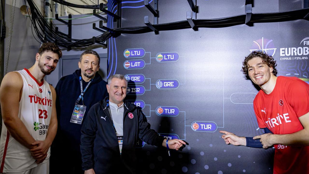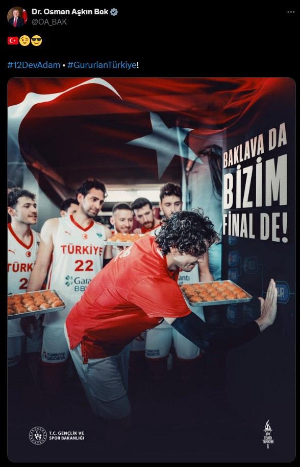 Bakan Bak’ın paylaşımında 12 Dev Adam’ın, final yoluna Türkiye’nin ismini yazdığı görüldü. Basketbolcuların elindeki baklava tepsileri olduğu görülürken “Baklava da bizim final de” yazısı dikkat çekti.