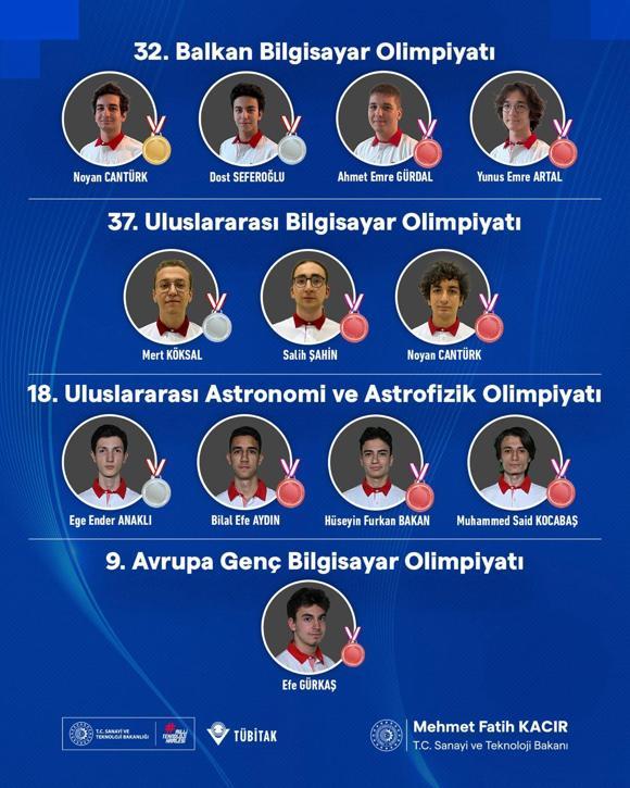 Sanayi ve Teknoloji Bakanı Kacır, 32’nci Balkan Bilgisayar Olimpiyatı, 37’nci Memleketler arası Bilgisayar Olimpiyatı, 18’inci Milletlerarası Astronomi ve Astrofizik Olimpiyatı ile 9’uncu Avrupa Genç Bilgisayar Olimpiyatlarında altın, gümüş ve bronz madalya alan Türk öğrencileri tebrik etti.