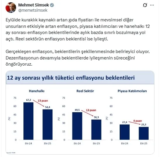 “Eylülde kuraklık kaynaklı artan besin fiyatları ile mevsimsel öteki ögelerin tesiriyle artan enflasyon, piyasa iştirakçileri ve hanehalkı 12 ay sonrası enflasyon beklentilerinde aylık bazda sonlu bozulmaya yol açtı. Gerçek dalın enflasyon beklentisi ise düzgünleşti.