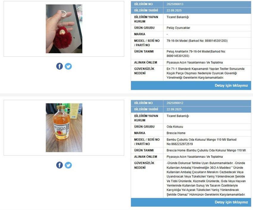 Yapılan kontrollerin akabinde Bakanlık, bir oyuncak ve bir oda kokusunun kullanımının inançsız ve sıhhatsiz olduğunu tespit etti.