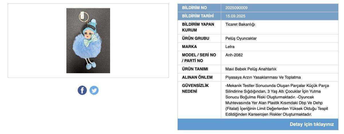 Güvensiz Eser Bilgi Sistemi’ne eklenen yeni eserde, Letra marka peluş anahtarlık sağlık açısından riskli bulundu.