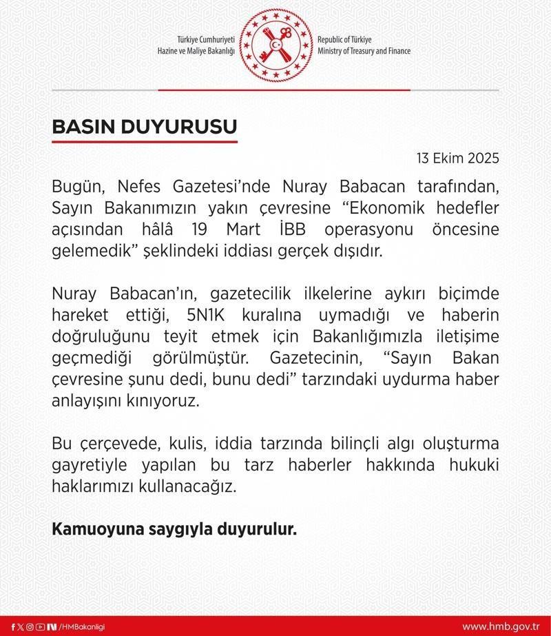 Açıklamada, bugün bir gazetede yayımlanan ve Bakan Şimşek’in yakın çevresine “Ekonomik amaçlar açısından hala 19 Mart İBB operasyonu öncesine gelemedik” dediği biçimindeki savların gerçek dışı olduğu bildirildi.