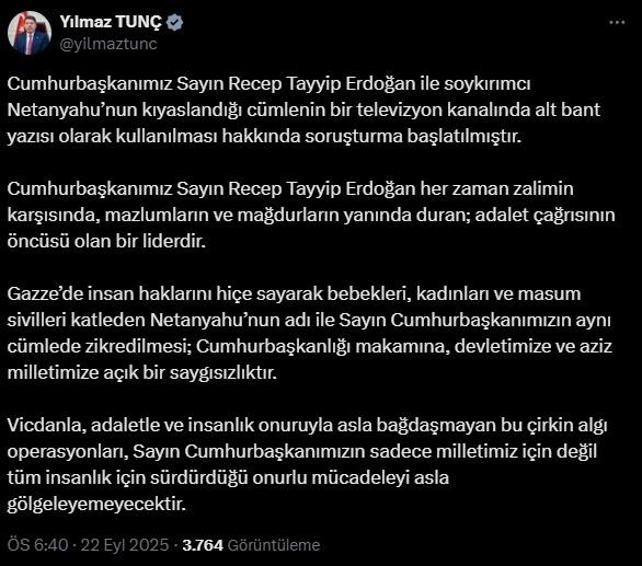 Sosyal medya hesabından yaptığı duyuruyla olayla ilgili soruşturma başlatıldığını belirten Bakan Yılmaz Tunç, “Cumhurbaşkanımız Sayın Recep Tayyip Erdoğan ile soykırımcı Netanyahu’nun kıyaslandığı cümlenin bir televizyon kanalında alt bant yazısı olarak kullanılması hakkında soruşturma başlatılmıştır.