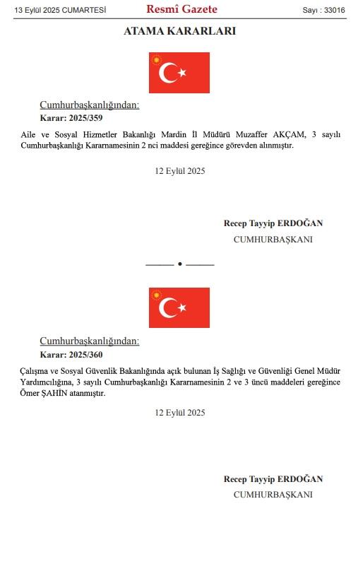 3 sayılı Cumhurbaşkanlığı Kararnamesinin 2’nci unsuru yeterince Aile ve Toplumsal Hizmetler Bakanlığı Mardin Vilayet Müdürü Muzaffer Akçam görevden alındı.