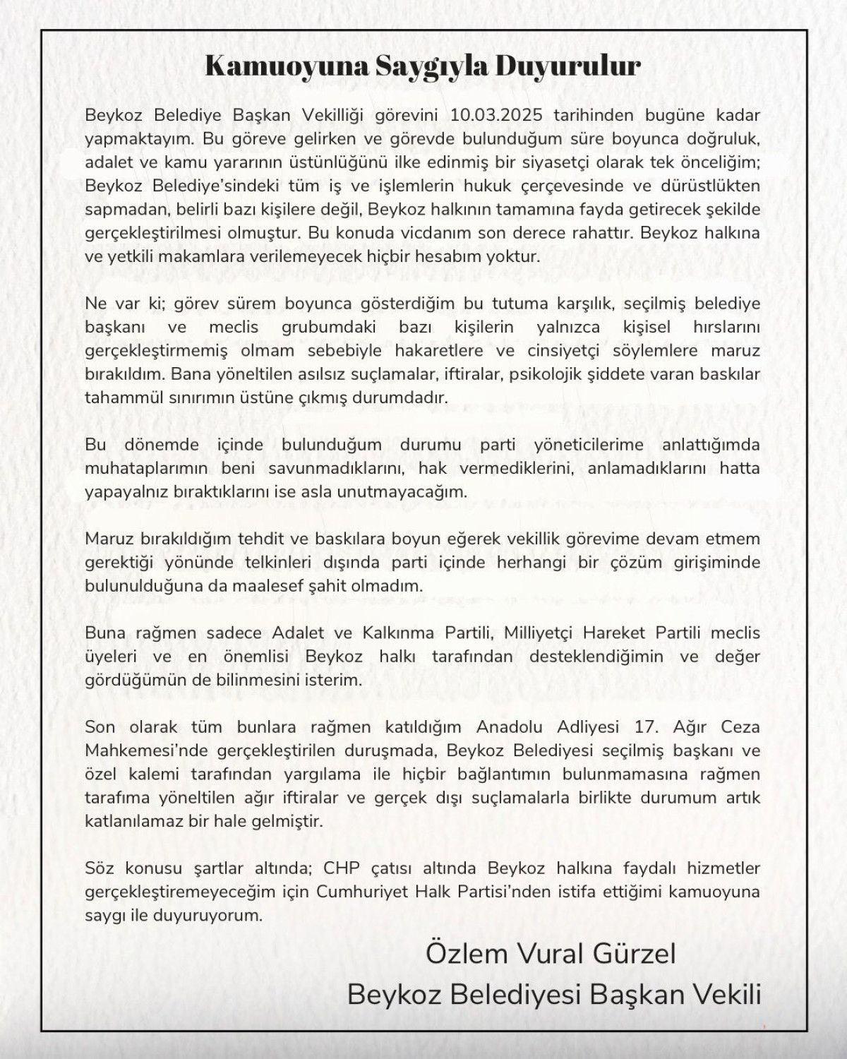 • “CHP çatısı altında Beykoz halkına yararlı hizmetler gerçekleştiremeyeceğim için Cumhuriyet Halk Partisi’nden istifa ettiğimi kamuoyuna hürmetle duyuruyorum.”