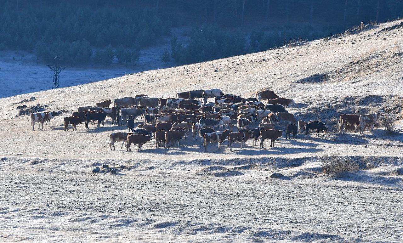 Küçük derelerin yüzeyinin buz tuttuğu ilçede besiciler, beyaz örtüyle kaplı çayırlık alanda hayvanlarını otlatmaya çalıştı.
