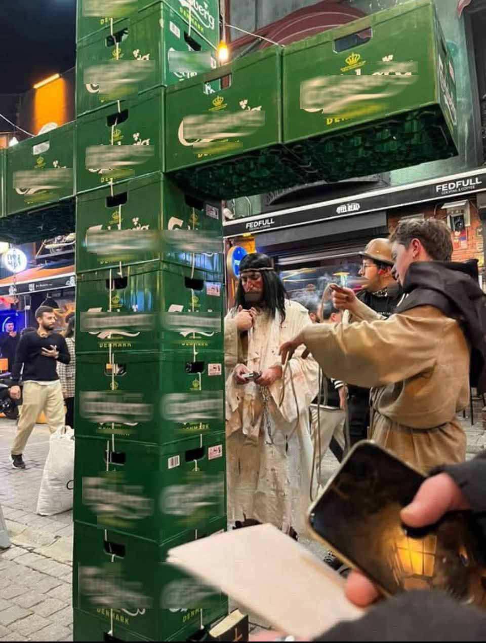 Eskişehir’de 3 kişi, 30 Ekim Perşembe gece 23.00 sıralarında ‘Cadılar Bayramı’ aktifliğine katılmak için boş bira kasalarından Hristiyanlara ilişkin haç işareti oluşturarak sokaklarda gezdi.