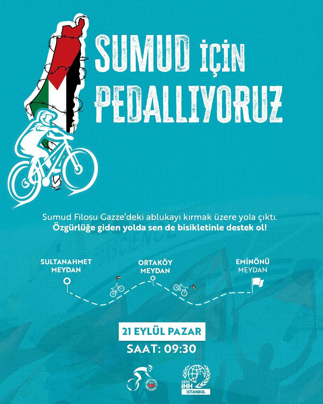 Dünyanın dört bir yanında Global Sumud Filosu’na takviye olmak emeliyle etkinlikler düzenleniyor. Bu kapsamda İstanbul’da da manalı bir aktiflik düzenlenecek. İstanbullu bisiklet severler, filoya dikkat çekmek ve dayanak olmak gayesiyle “Sumud İçin Pedallıyoruz” etkinliğinde bir ortaya gelecek.