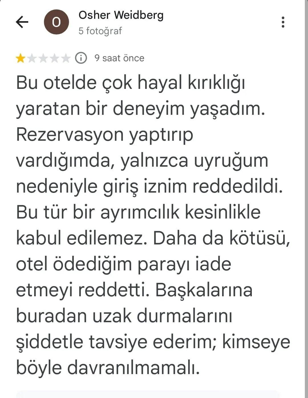 Olay İsraillinin, otelin hesabının altına “Osher Weidberg” ismiyle yaptığı paylaşımla ortaya çıktı. İşgalci yaptığı paylaşımda, “ücretini ödemesine karşın ayrımcılığa uğradığını ve otele alınmadığını” öne sürdü.