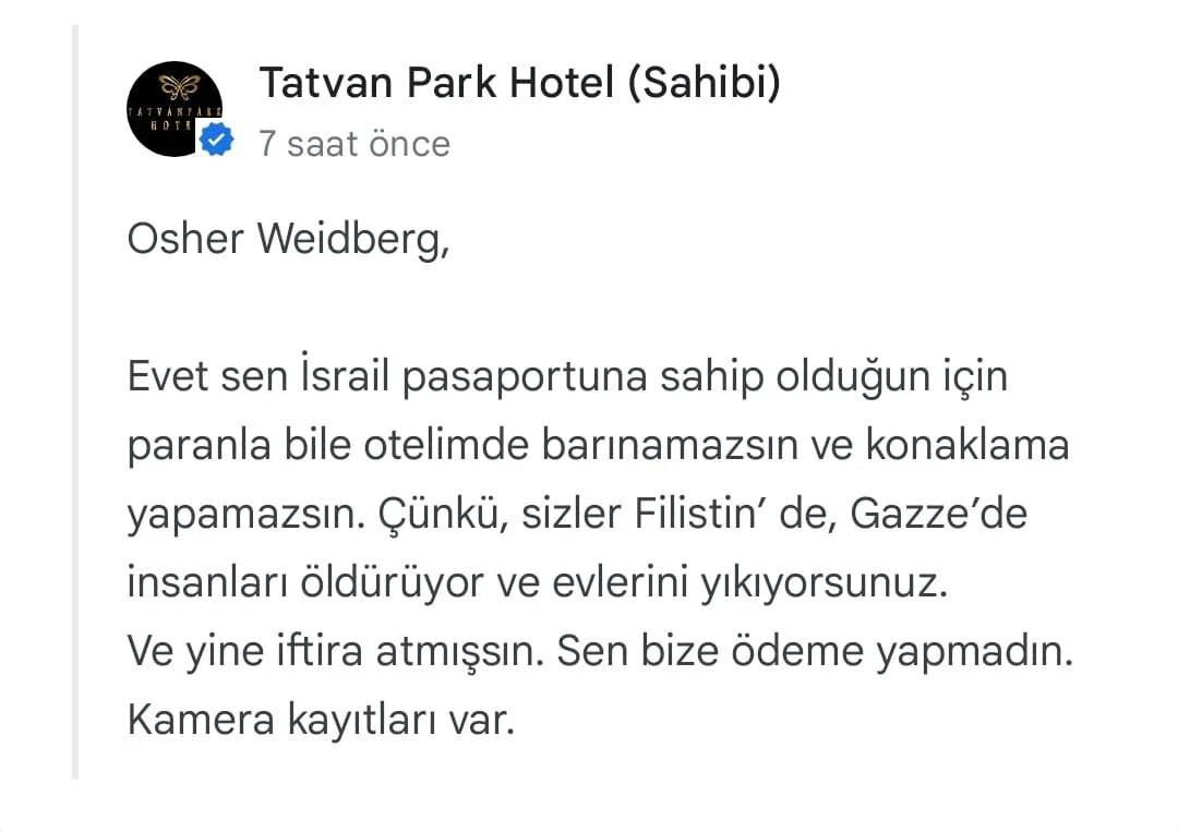 Geçtiğimiz günlerde Bitlis’in Tatvan ilçesinde bulunan Tatvan Park Otel isimli işletme, kendilerine işgalci İsrail pasaportunu ibraz eden şahsın resepsiyonunu iptal etti.