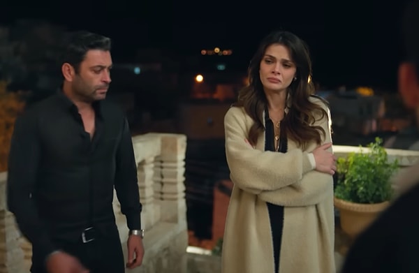 Bu sahnedeki kombinde uzun triko hırkası yeniden Olcay markasından, içindeki yeşil kadife kadrosu ise Beymen Collection’dan. Sahnedeki duruşunu hem şık hem rahat gösteren kusursuz bir kombin olmuş.