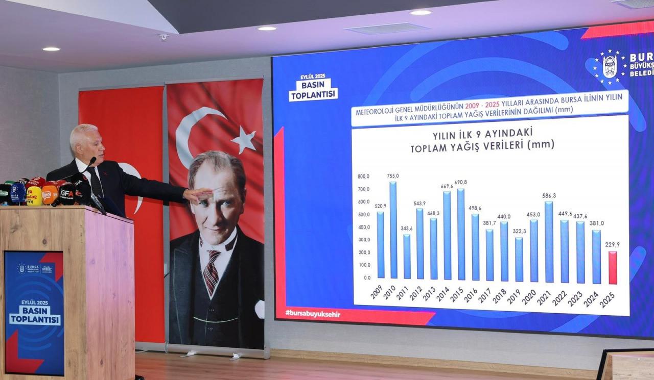 Şifalı kaplıcalarıyla tüm dünyada isminden kelam ettiren Bursa’da, yer altı su kaynaklarının derinliğinin ise kuraklığa bağlı olarak yıllar içinde 10 metreden, 250 metreye kadar indiğini söyleyen Büyükşehir Belediye Başkanı Mustafa Bozbey, “Kentimizin su muhtaçlığının yaklaşık yüzde 85’i Doğancı ve Nilüfer barajlarından, yüzde 15’i ise Uludağ pınar kaynaklarından karşılanıyordu. Fakat yaşanan kuraklık nedeniyle suyumuzun yüzde 50’si Doğancı ve Nilüfer barajlarından, yüzde 15’i pınar kaynaklarından, yüzde 35’i ise BUSKİ’ye ilişkin 155 adet derin su kuyusundan sağlanıyor. Yer altı su düzeyinin 250 metrelere kadar indiğine de dikkat çekmek istiyorum. Bursa Ovası’nın ne kadar kuraklık yaşadığının da göstergesidir.” tabirlerini kullandı.