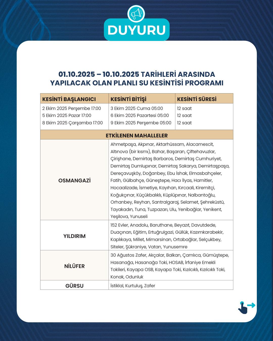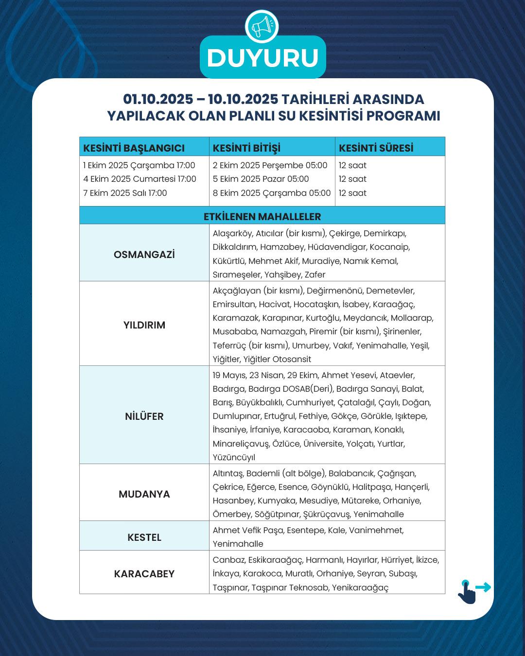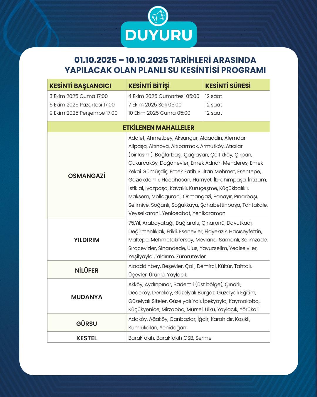 Konuyla ilgili BUSKİ Genel Müdürlüğünden yapılan açıklamada, “BUSKİ Genel Müdürlüğümüz tarafından, yaşanan global ısınmaya bağlı iklim değişikliği sonucunda ortaya çıkan kuraklık sonucu su kaynaklarının azalması ve baraj doluluk oranlarının kritik düzeye düşmesi sebebiyle, planlı su kesintisi yapılması mecburiyeti/ihtiyacı doğmuştur. Kelam konusu planlı su kesintileri, günlük 12 saati geçmemek kaydıyla, merkez ilçelere bağlı mahallelerde dönüşümlü olarak uygulanacaktır. Yapılması planlanan su kesintileri ile günlük 100 bin metreküp su tasarrufu yapılması hedeflenmektedir. Yağmurların yağması ardından barajlarımızda kâfi ölçüde su rezervi oluştuğu takdirde kesintiler sona erdirilecektir. Yönetimimiz tarafından sağlanan içme suyunun kalitesi 24 saat boyunca izlenmekte olup sağladığımız suyun inançla tüketilmesinde rastgele bir sakınca bulunmamaktadır. Planlı su kesintilerinden, Uludağ Üniversitesi, Şehir Hastanesi ve Devlet Hastaneleri etkilenmeyecektir. Planlı su kesinti listesi ekte sunulmuştur.” tabirlerine yer verildi.