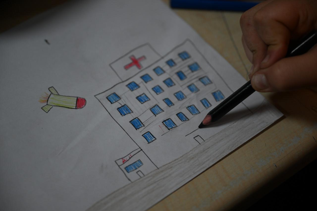 Bazı öğrenciler, hastane üzere sivil kuruluşların bombalanmasını resmetti.