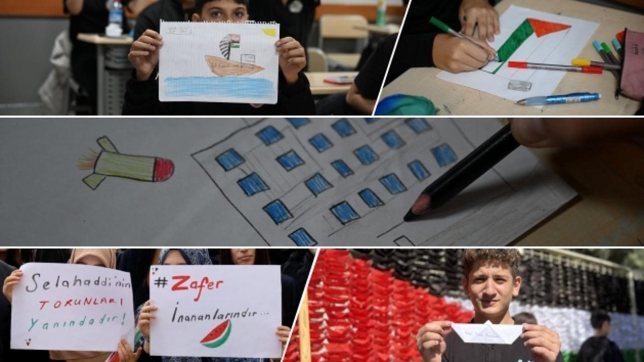 Bazı okullarda Gazze’ye mektup yazıldı. Öğrenciler okula girişte öğrencileri Filistin’e yönelik dövizlerle karşıladı.