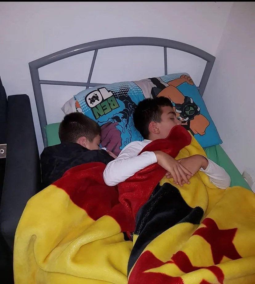Yine bir öbür fotoğrafta, iki futbolcunun Galatasaray armasının yer aldığı bir battaniyeye sarılıp uyurken çekilmiş halleri mevcut.