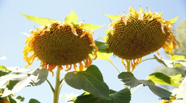 Boyu 2 metreyi bulan ayçiçeklerinin biçerdöverle hasat edilmesinin akabinde çekirdekleri branda üzerinde kurutulmaya bırakılıyor.