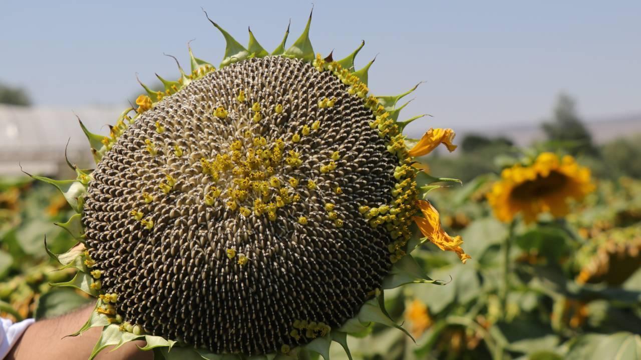 Boyu 2 metreyi bulan ayçiçeklerinin biçerdöverle hasat edilmesinin akabinde çekirdekleri branda üzerinde kurutulmaya bırakılıyor.