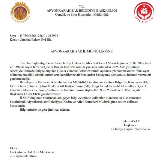 Afyonkarahisar Vilayet Müftülüğü’ne gönderilen yazıda, Cumhurbaşkanlığı Genel Sekreterliği’nin “2025 Aile Yılı” kapsamında yayımladığı genelgeyi mazeret edildi. Belediye Lider Yardımcısı Aksiyon Ayar imzasıyla gönderilen dokümanda, müftülükten en kısa müddette alanların tahliye edilmesi istendi.
