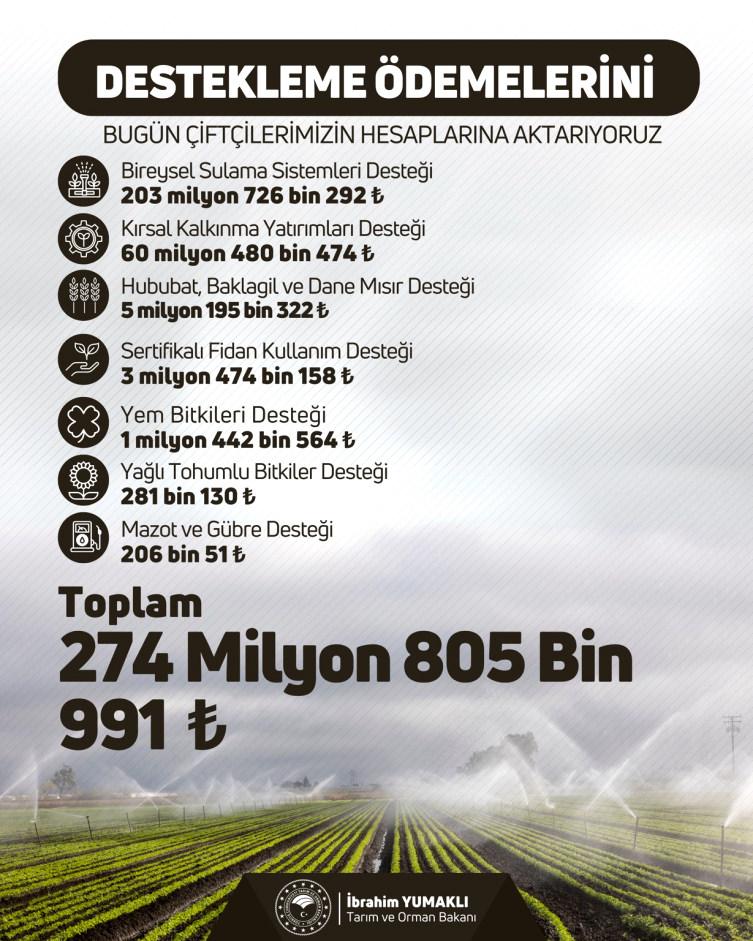 Paylaşımda yer alan bilgiye nazaran, ferdî sulama sistemleri için 203 milyon 726 bin 292 lira, kırsal kalkınma yatırımları için 60 milyon 480 bin 474 lira, hububat, baklagil ve dane mısır için 5 milyon 195 bin 322 lira, sertifikalı fidan kullanımı için 3 milyon 474 bin 158 lira, yem bitkileri için 1 milyon 442 bin 564 lira, yağlı tohumlu bitkiler için 281 bin 130 lira, mazot ve gübre için 206 bin 51 lira takviye verilecek.