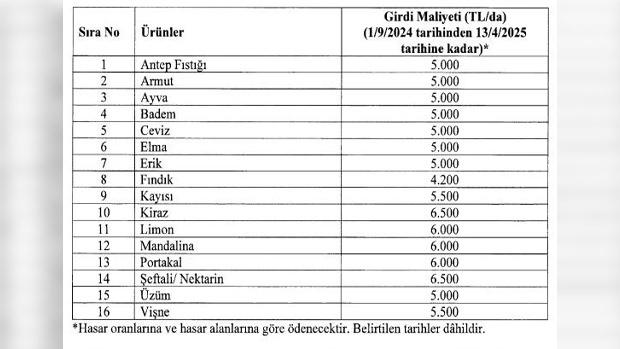 Cumhurbaşkanı Kararı’yla belirlenen dekar başına girdi maliyetleri şu halde: