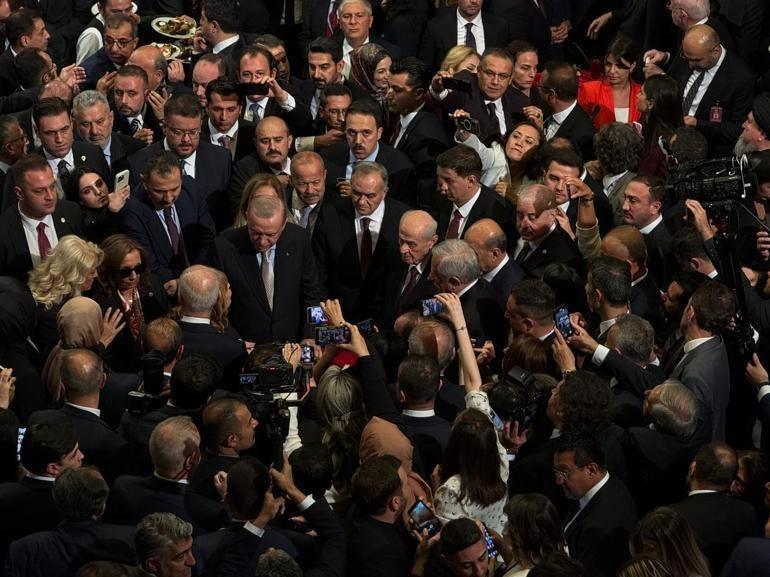 Cumhurbaşkanı Erdoğan burada, DEM Parti Eş Genel Lideri Tuncer Bakırhan ve İmralı Heyeti Üyesi Mithat Sancar ile sohbet etti. Cumhurbaşkanı Erdoğan, MHP Genel Başkanı Devlet Bahçeli ile sohbet etti.