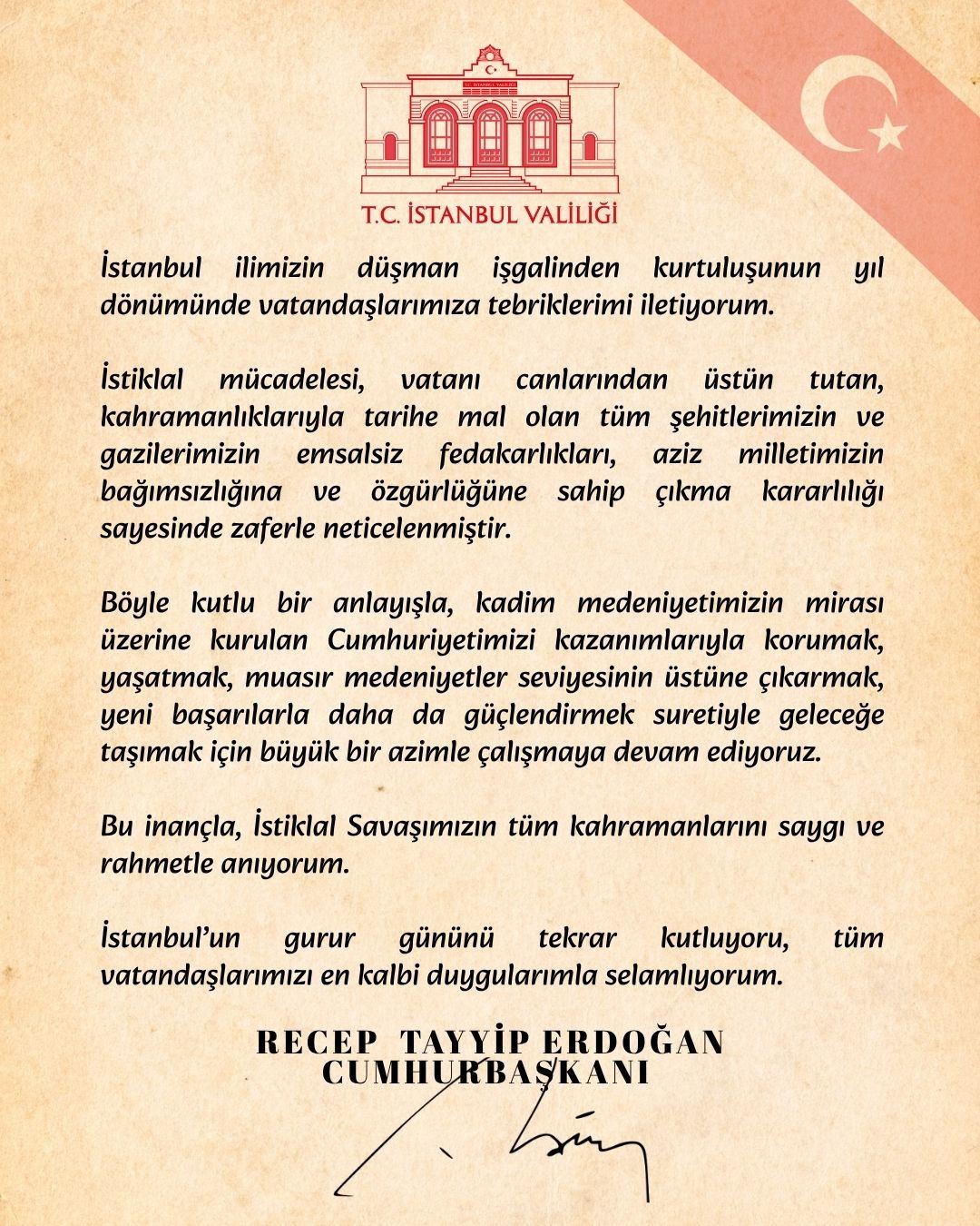 Erdoğan bildirisinde, İstiklal Savaşı’nın tüm kahramanlarını rahmet ve minnetle andığını belirterek, “İstanbul’un gurur gününü kutluyor, tüm vatandaşlarımızı en kalbi hislerimle selamlıyorum.” tabirlerine yer verdi.