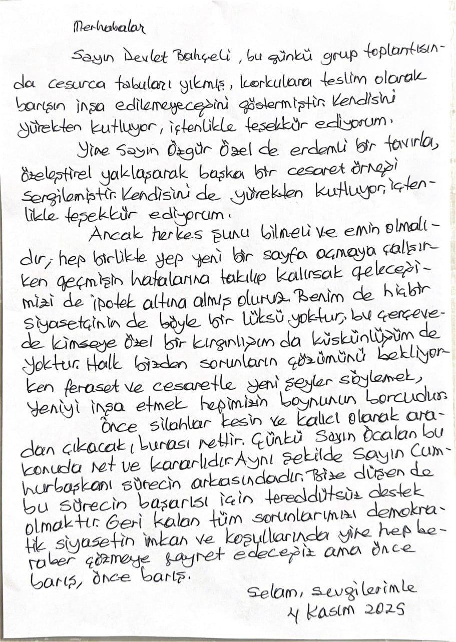 Edirne Cezaevi’nde tutuklu bulunan eski HDP Eş Genel Başkanı Selahattin Demirtaş, “Sayın Devlet Bahçeli, bugünkü küme toplantısında cesurca tabuları yıkmış, dehşetlere teslim olarak barışın inşa edilemeyeceğini göstermiştir. Kendisini yürekten kutluyor, samimiyetle teşekkür ediyorum” dedi.