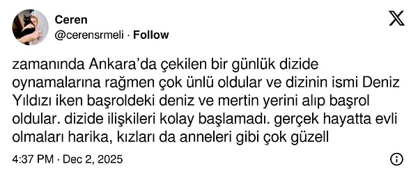 Televizyon tarihinin en uzun soluklu günlük dizilerinden Deniz Yıldızı, yalnızca ekran başındaki izleyicilere değil, set ardında da kocaman bir aşk öyküsü yazdı. Dizide Banu ve Melih karakterlerine hayat veren Begüm Topçu ve Cantuğ Turay, o yıllarda milyonların severek izlediği çift olmuştu.