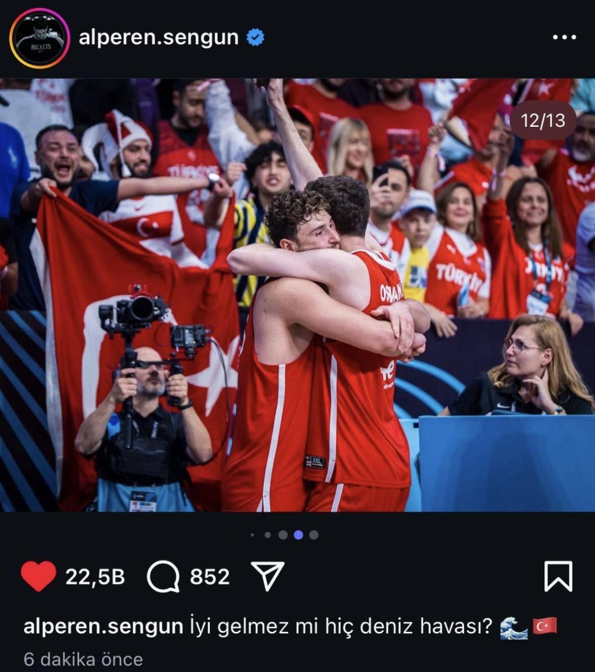 Milli grubun yıldızlarından Alperen Şengün de maçın akabinde toplumsal medya hesabından, bir paylaşımda bulunarak “İyi gelmez mi hiç deniz havası?” tabirlerini yazarak göndermede bulundu.