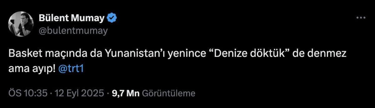 Deutsche Welle Türkçe muharriri Bülent Mumay, toplumsal medya hesabından yaptığı paylaşımda, “Basket maçında da Yunanistan’ı yenince ‘Denize döktük’ de denmez lakin, ayıp” diyerek reaksiyon gösterdi.