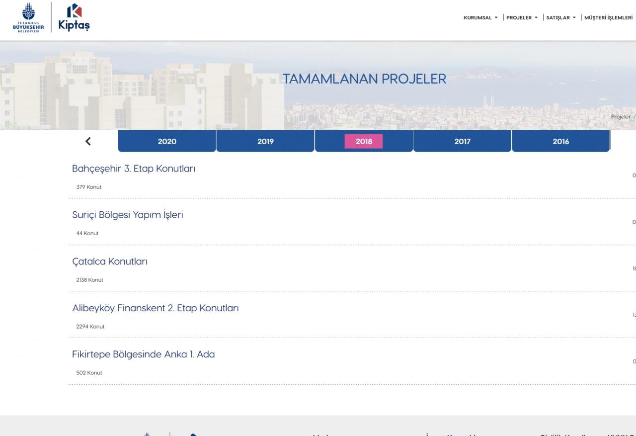 KİPTAŞ’ın resmi internet sitesinde 2018 yılında tamamlandığı ilan edilen projeler şunlar: