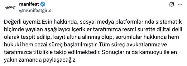 Manifest kızları, küme üyeleri Esin Bahat’ın dış görünümü hakkında sistematik olarak yapılan aşağılayıcı paylaşımlar için türel süreç başlattığını duyurdu.