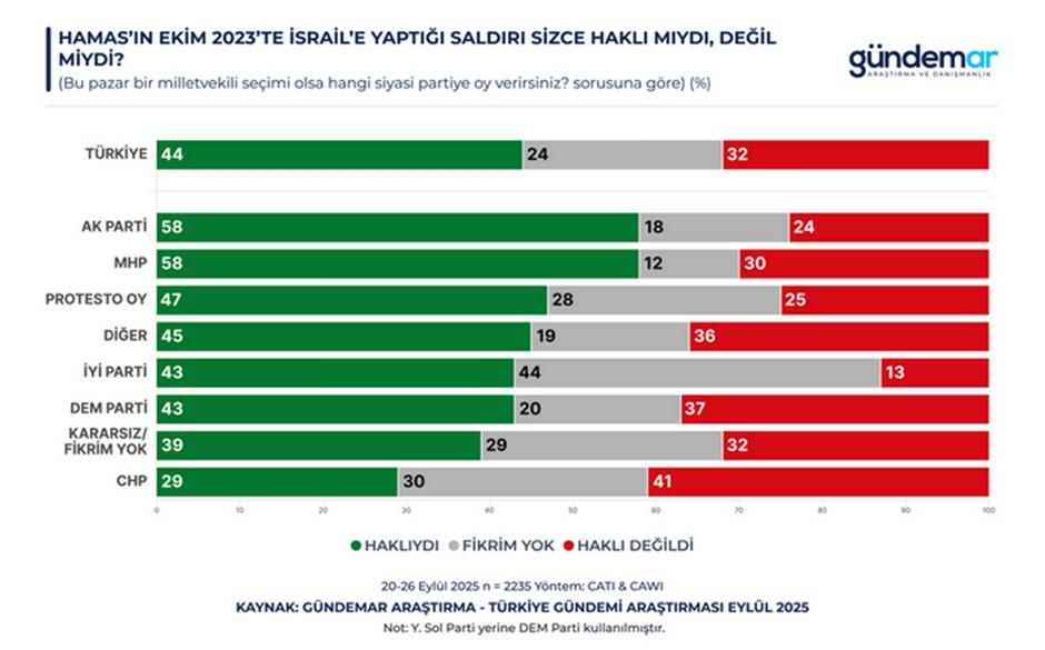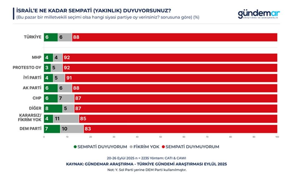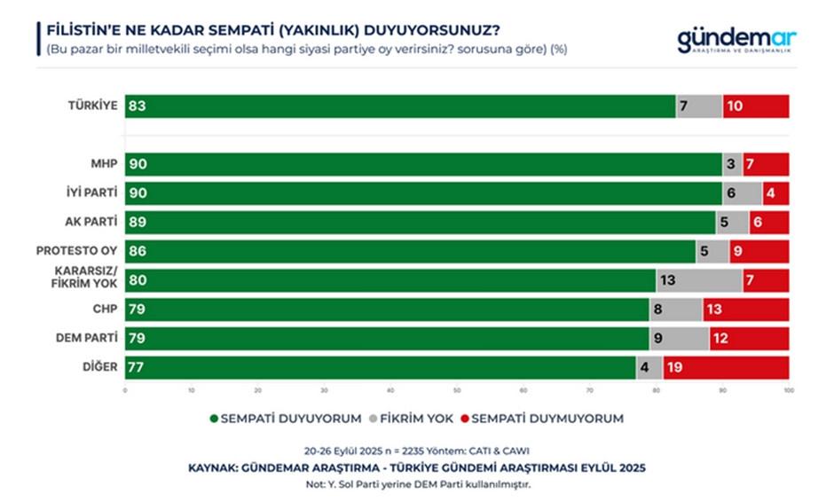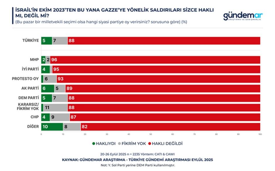 20–26 Eylül 2025 tarihleri ortasında 60 vilayette 2 bin 235 bireyle yapılan Türkiye Gündemi Araştırması, kamuoyunun Gazze soykırımına bakışını ortaya koydu.