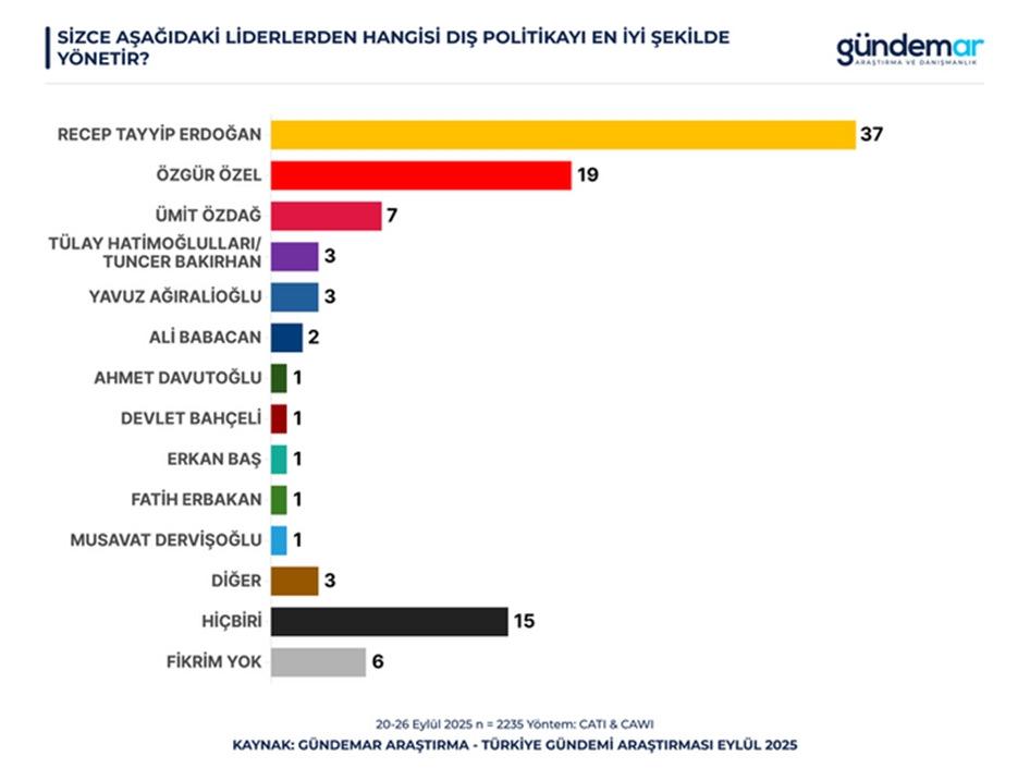 Anketin siyasi sonuçları da dikkat çekti. İştirakçilerin yüzde 37’si dış politikayı en düzgün yönetecek başkan olarak Recep Tayyip Erdoğan’ı işaret etti.